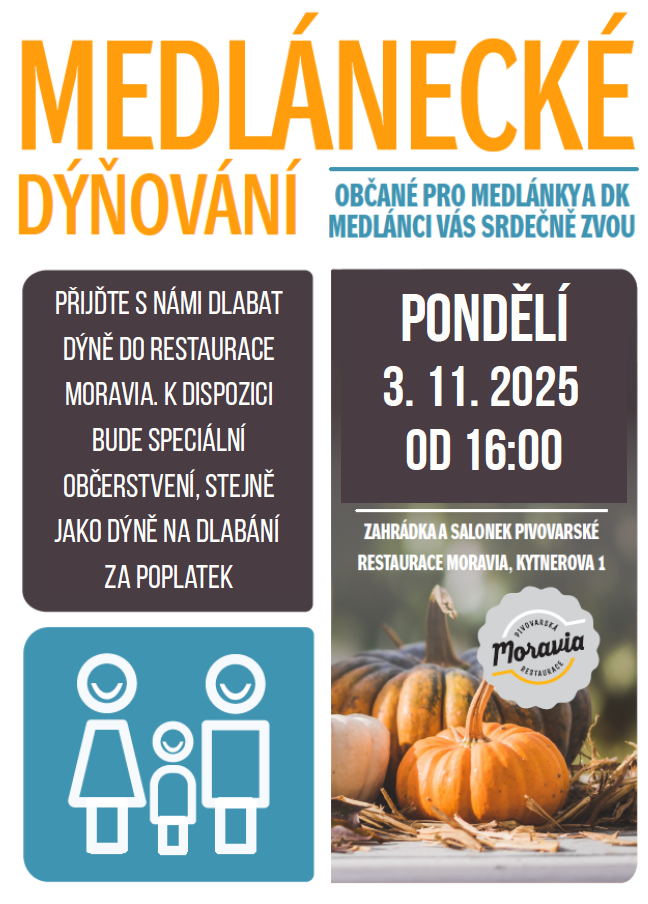 I letos pro vás chystáme Medlánecké dýňování a to ve spolupráci s DK Medlánci a Pivovarskou restaurací Moravia. tak vezměte ratolesti a pojďte s námi „dlabat“.