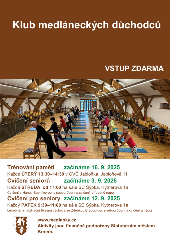 Máte-li zájem jako senior z Medlánek se aktivit zúčastnit, přijměte naše srdečné pozvání a přijďte, na některou z uvedených lekcí.